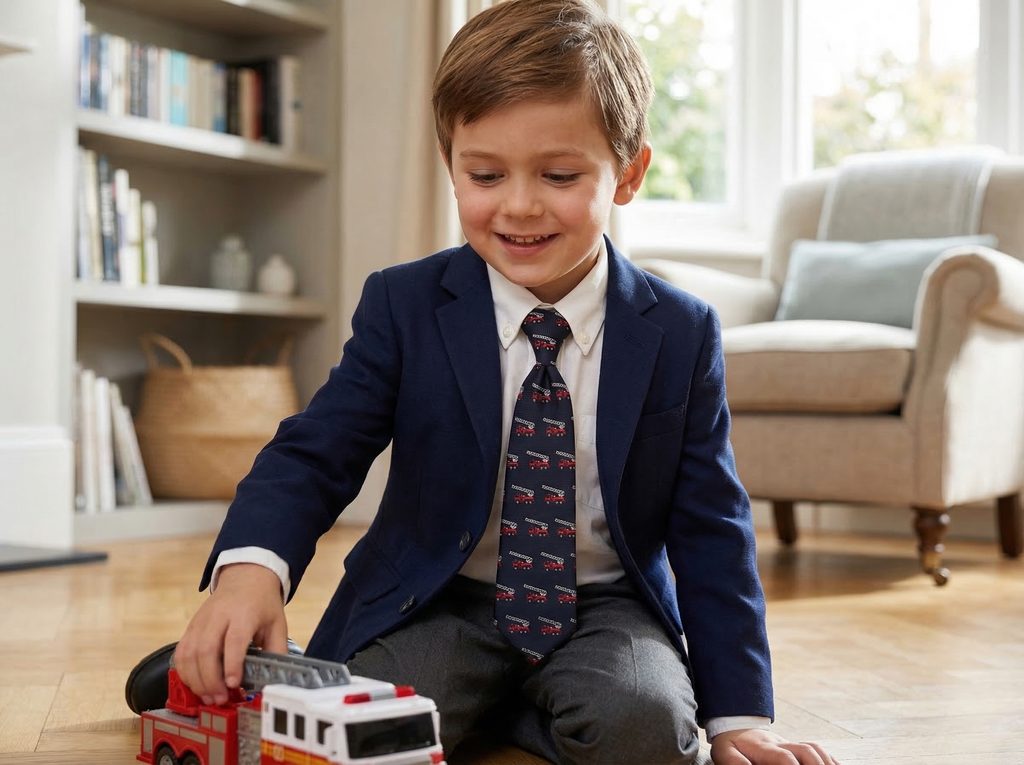 Táto chlapčenská kravata s motívom hasičského auta je skvelým doplnkom pre deti, ktoré obdivujú hasičov a záchranárske autá. Tmavomodrý základ dopĺňa hravý vzor, ktorý dodáva slávnostnému outfitu veselý a originálny charakter. Kravata sa hodí na rodinné oslavy, školské vystúpenia alebo iné príležitosti, kde chce malý hrdina vyzerať štýlovo.