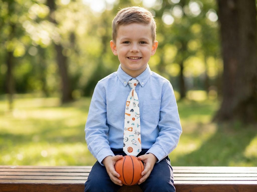 Energia športu sa môže odraziť aj v elegantnom detskom doplnku. Táto detská kravata zaujme veselým vzorom so športovou tematikou, ktorý na svetlom podklade pôsobí hravo a originálne. Vďaka tomu sa z klasickej kravaty stáva zaujímavý detail, ktorý poteší každého malého športovca.