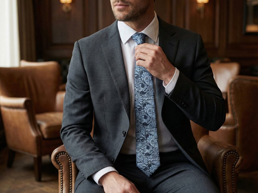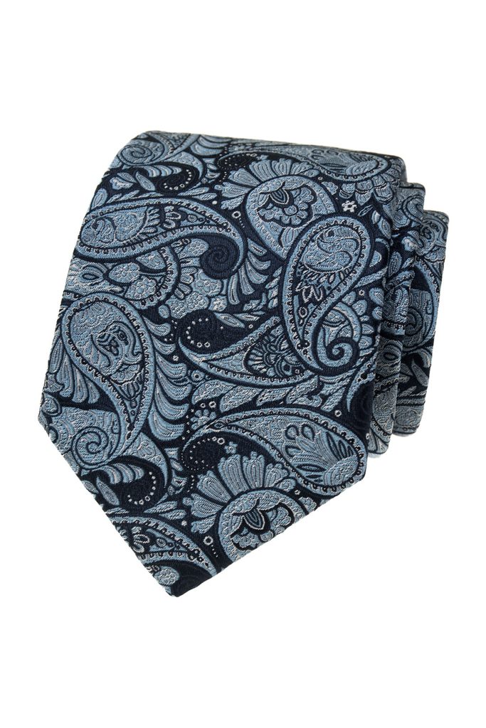 Táto tmavomodrá kravata so svetlomodrým paisley vzorom zaujme bohatými ornamentmi a kontrastom farieb. Svetlomodrý paisley motív krásne vynikne na tmavom podklade. Vzory pôsobia výrazne, no stále veľmi kultivovane. Ideálna voľba pre muža, ktorý chce oživiť klasický oblek.