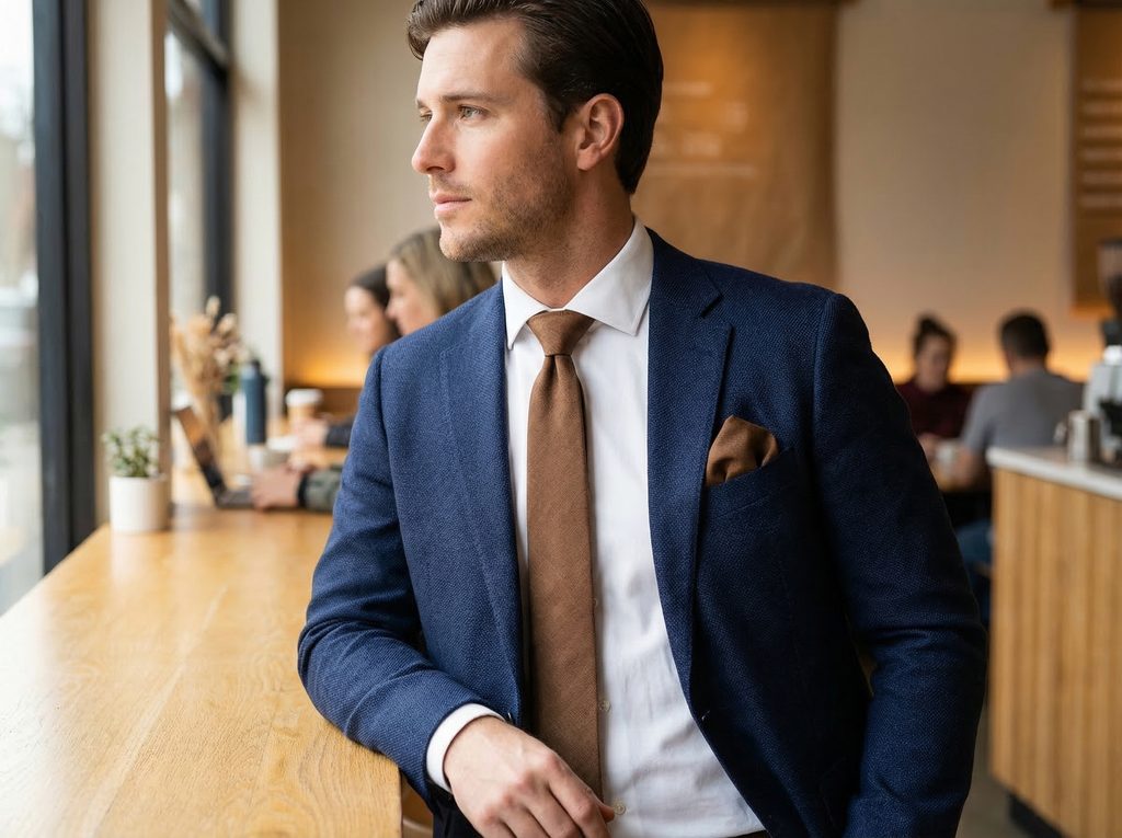 Najlepšie vynikne s bielou, svetlomodrou alebo krémovou košeľou, ktorá zvýrazní jej teplý tón. Výborne ju doplní tmavomodrý, sivý alebo béžový oblek, kde pôsobí harmonicky a vyvážene. Vďaka setu môžete použiť aj priloženú vreckovku, ktorá udrží celý outfit zladený. Pre uvoľnenejší štýl zvoľte svetlé sako a hladkú košeľu bez vzoru. Doplnky v zemitých odtieňoch ešte viac podporia celkový dojem.