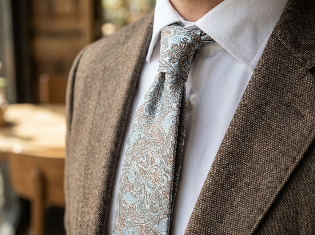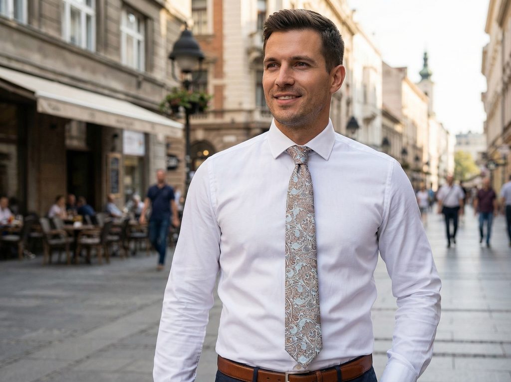 Výborne funguje v svetlejších kombináciách – béžový oblek a svetlá košeľa vytvoria čistý, svieži vzhľad bez zbytočnej námahy. V spojení s tmavomodrým oblekom táto kravata outfit odľahčí a dodá mu prirodzenejší charakter. Doplniť ju môžete o jemný vreckovka do saka v podobných tónoch alebo traky v béžovej či hnedej farbe – ideálna voľba na svadbu, letné oslavy alebo dni, keď chcete vyzerať dobre bez zbytočného premýšľania.