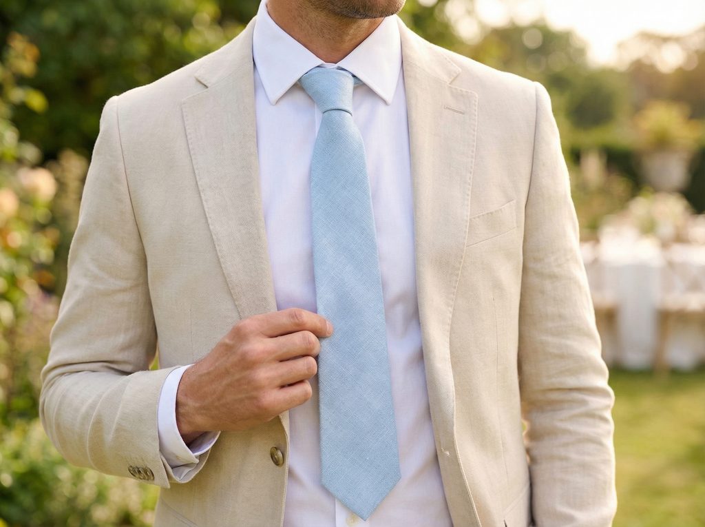 Kombinujte so svetlosivým alebo pieskovým oblekom. Bielu košeľu doplňte decentnou vreckovkou v krémovom tóne.