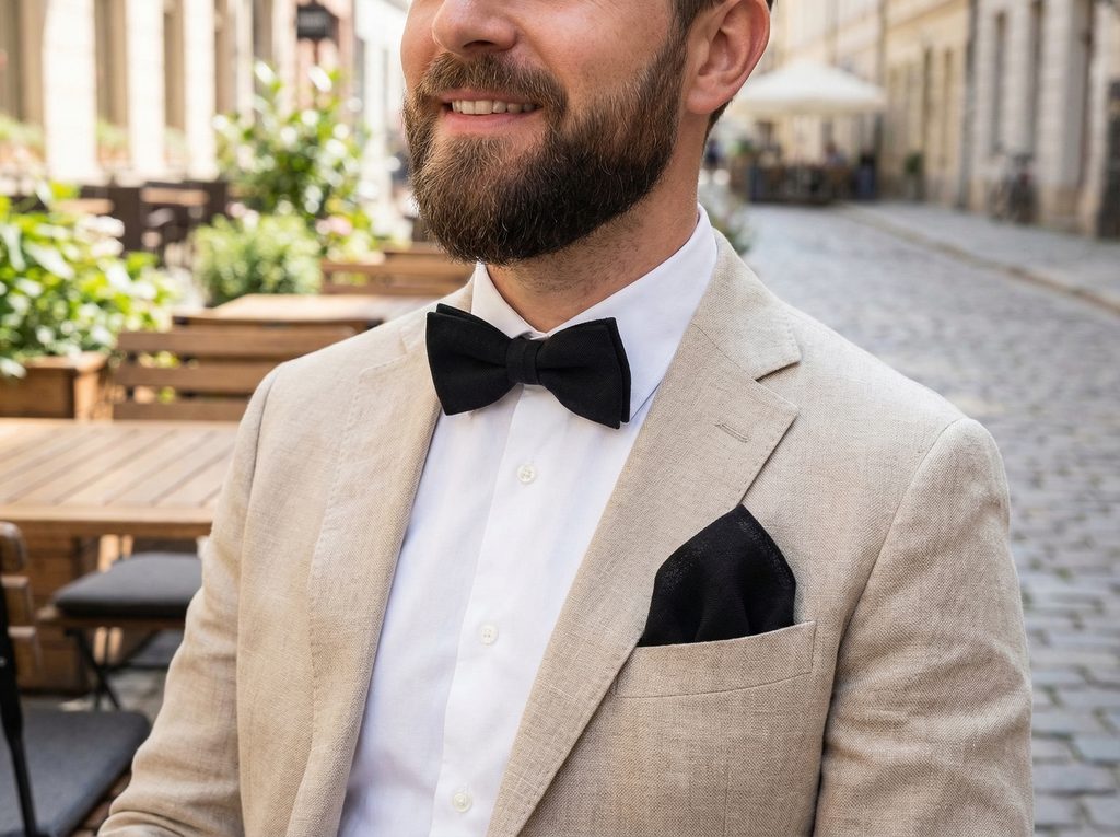 Čierna v ľanovom prevedení pôsobí uvoľnenejšie než klasické hladké materiály. Jemná štruktúra dodáva outfitu prirodzený charakter a odľahčuje celkový dojem. Čierny ľanový motýlik s vreckovkou je preto vhodný aj tam, kde chcete elegantný štýl bez zbytočnej strohosti.
