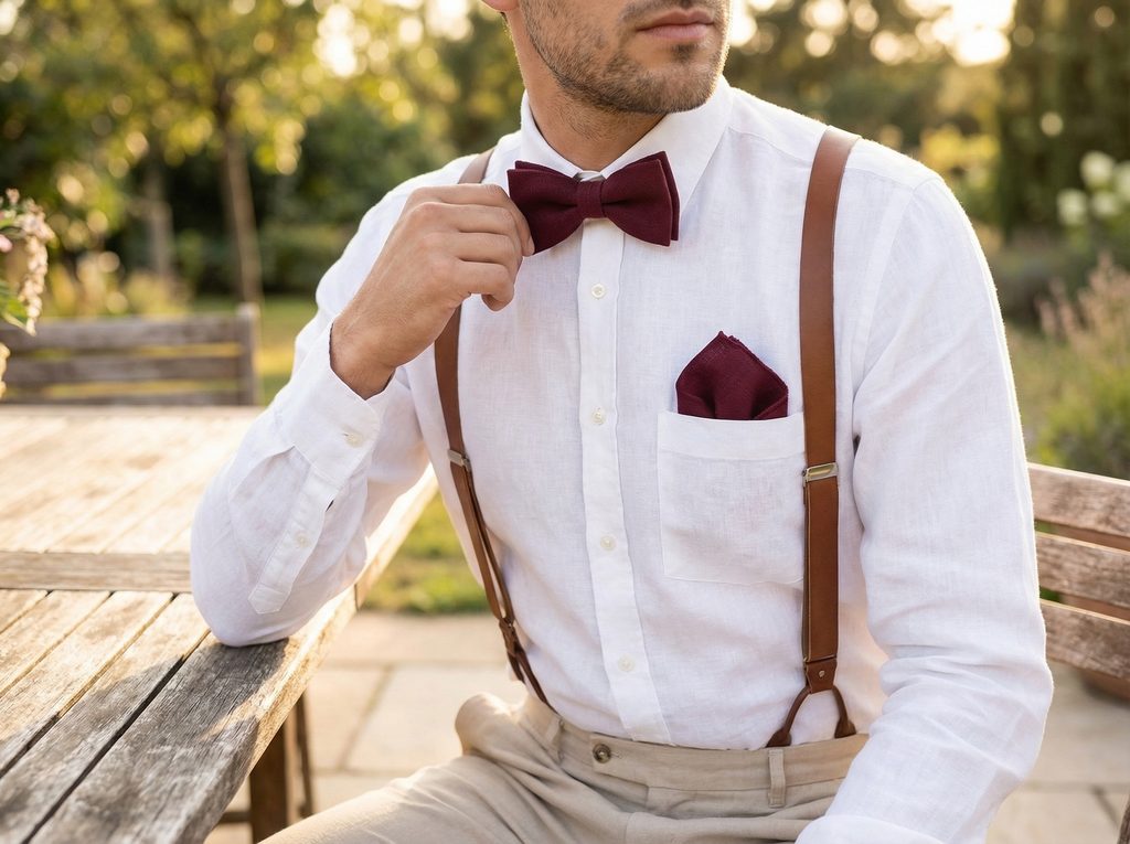 Hodí sa na svadby, letné oslavy aj večerné stretnutia, kde chcete pôsobiť upravene, ale zároveň prirodzene. Bordový odtieň sa dobre kombinuje so svetlejšími kúskami a dodáva celku teplejší tón. Vreckovka pomáha prepojiť celý outfit a vytvára ucelený dojem. Ak doplníte aj kvalitnú pánsku košeľu, vznikne kombinácia, ktorá pôsobí nenútene, ale premyslene. Práve pánsky motýlik tu funguje ako detail, ktorý drží celý outfit pohromade.