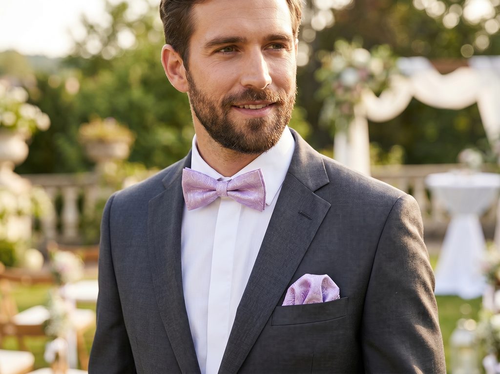 Lila odtieň najlepšie vynikne s tmavším oblekom, napríklad v modrej alebo sivej farbe, kde vytvára jemný kontrast. Na svadbe ho môžete doplniť bielou alebo svetloružovou košeľou, ktorá zvýrazní jeho ľahkosť. V modernejšej kombinácii sa hodí aj k svetlému saku, kde motýlik prirodzene vystúpi ako hlavný farebný prvok outfitu.