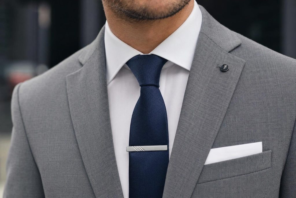 Nie všetko musí byť výrazné, aby to fungovalo. Strieborná spona na kravatu s jemnými líniami pôsobí pokojne, drží celý outfit pokope a pridáva detail, ktorý si všimnete až pri bližšom pohľade.