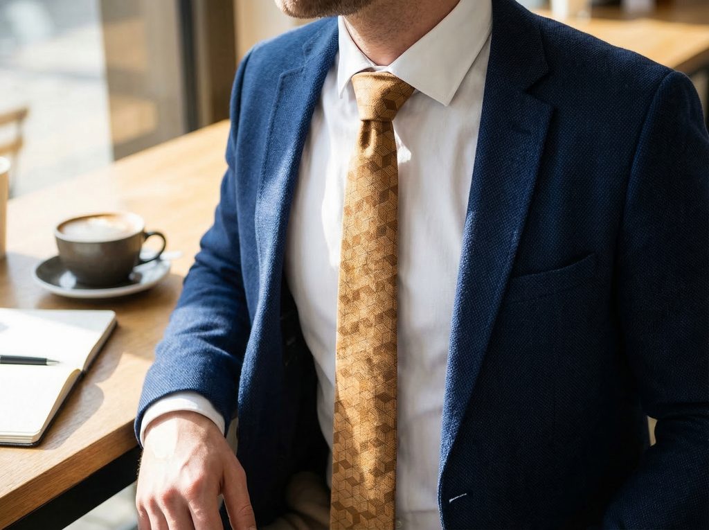 Okrová bavlnená kravata sa veľmi dobre kombinuje s tmavomodrým alebo hnedým oblekom, kde sa jej teplé farby prirodzene zvýraznia. Svetlosivé sako dodá kombinácii ľahší a modernejší charakter. Najlepšie ju doplní biela alebo svetlomodrá košeľa, ktorá vytvorí čistý kontrast a zachová elegantný, harmonický vzhľad celého outfitu.