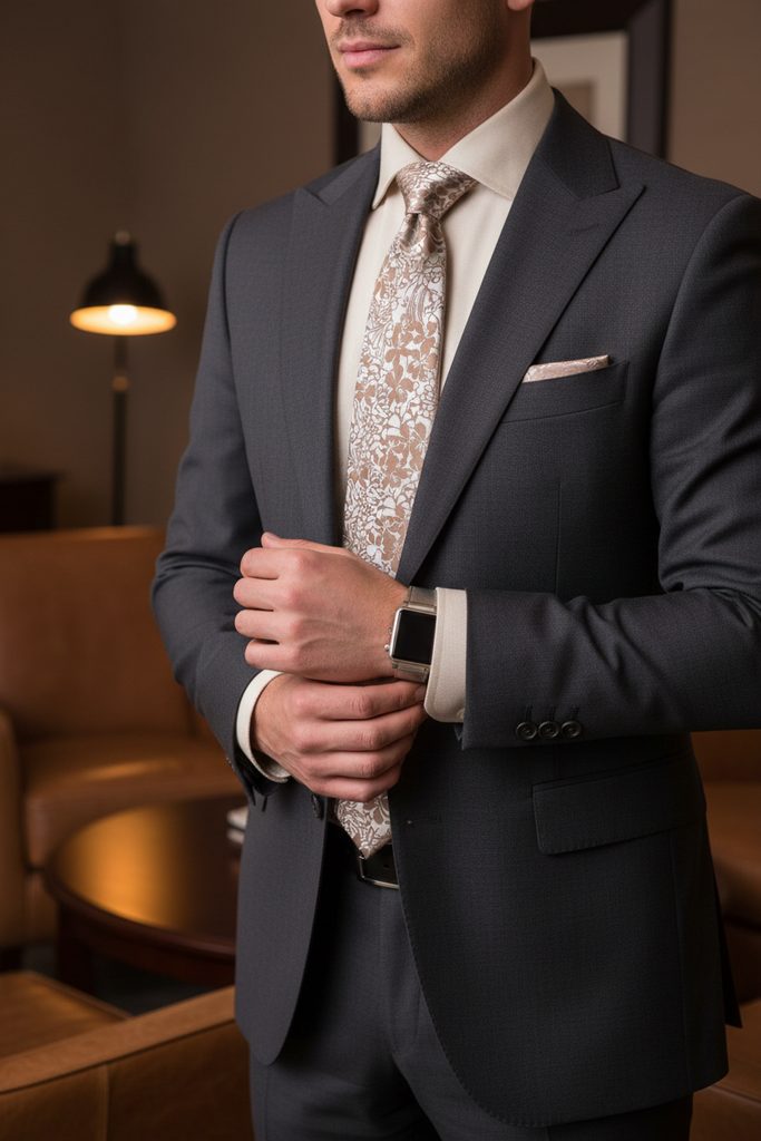 Pánska kravata vyrobená z polyesteru o šírke 7 cm. Kravata má elegantný vzor v hnedej a béžovej farbe s kvetinovými ornamentmi.