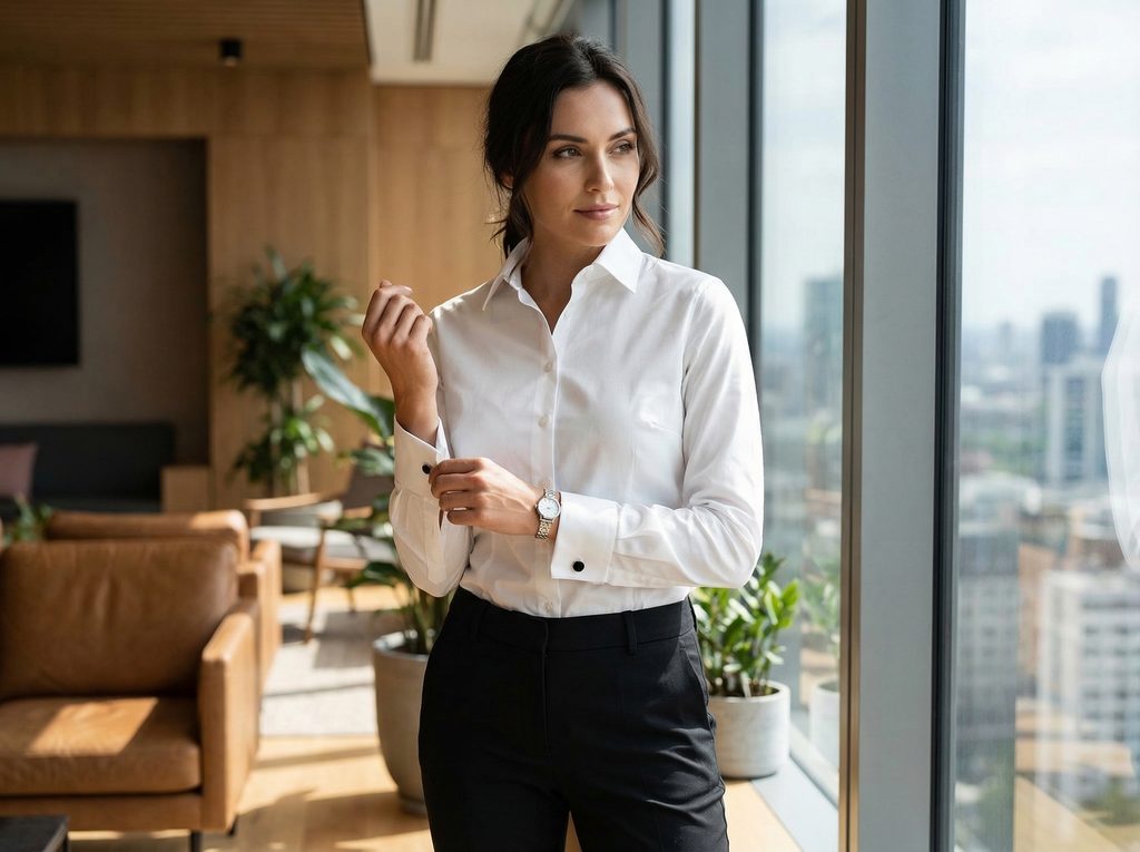 Košeľa sa výborne hodí k elegantným nohaviciam, sukni alebo k dámskemu kostýmu. V kombinácii so sakom vytvára upravený a profesionálny outfit vhodný do práce aj na spoločenské príležitosti.