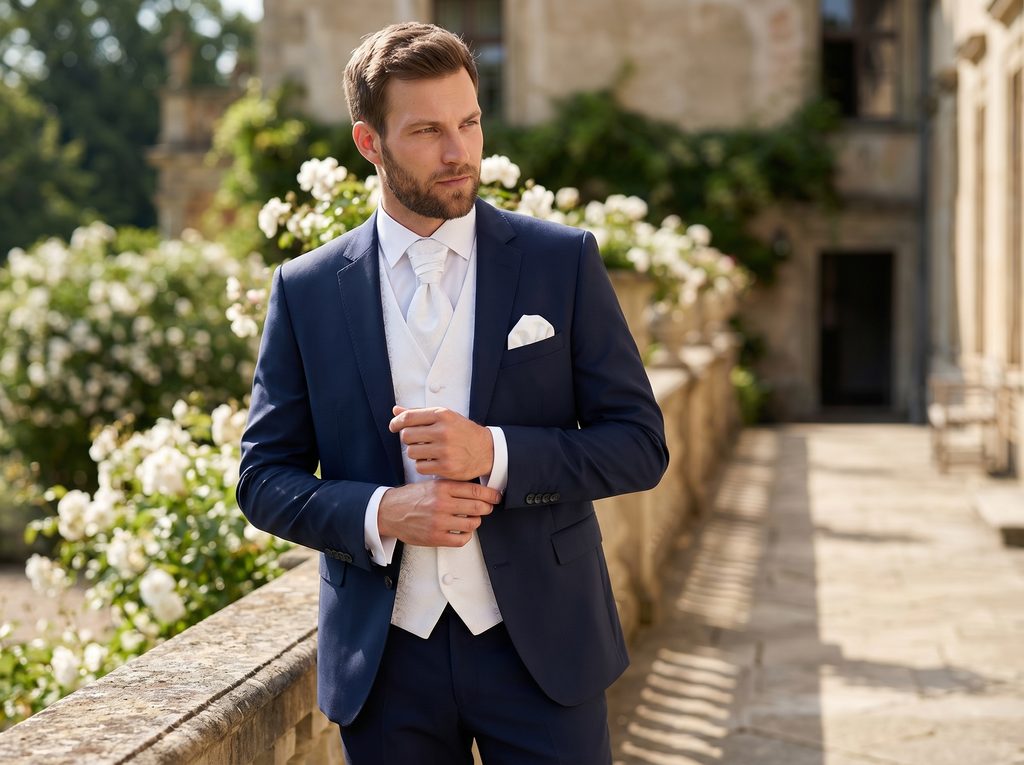 Pri čiernom obleku pôsobí set mimoriadne reprezentatívne a slávnostne. Tmavomodrý oble k mu dodá modernejší a jemnejší kontrast, pričom zachová eleganciu. Svetlosivý outfit zvýrazní detail výšivky a dodá celku ľahkosť. V kombinácii s bielou košeľou vznikne luxusný, takmer monochromatický svadobný vzhľad. Celkový dojem je harmonický, vyvážený a presne taký noblesný, aký si svadobný deň zaslúži.