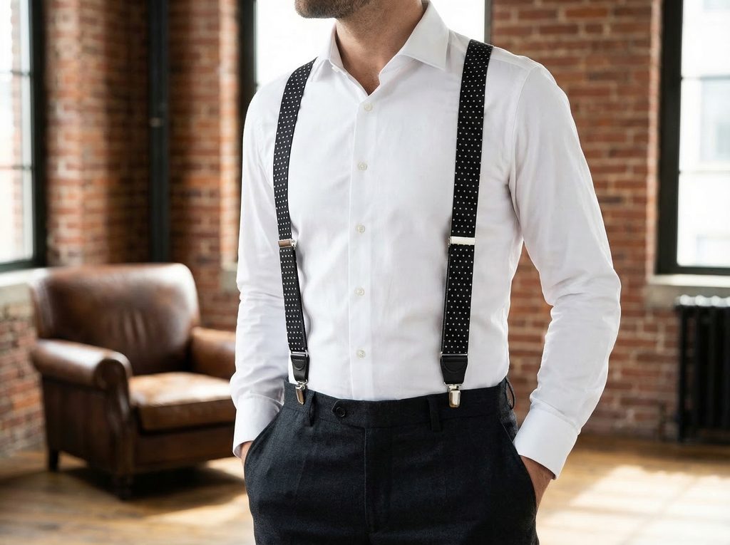 Kontrast čiernej a bielej patrí medzi klasiku, ktorá nikdy nestráca svoj štýl. Čierne pánske traky s bielymi bodkami pôsobia elegantne, no zároveň prinášajú do outfitu jemne hravý detail. Minimalistický bodkovaný vzor na tmavom podklade vytvára zaujímavý vizuálny efekt, ktorý dopĺňajú čierne prvky z pravej kože.