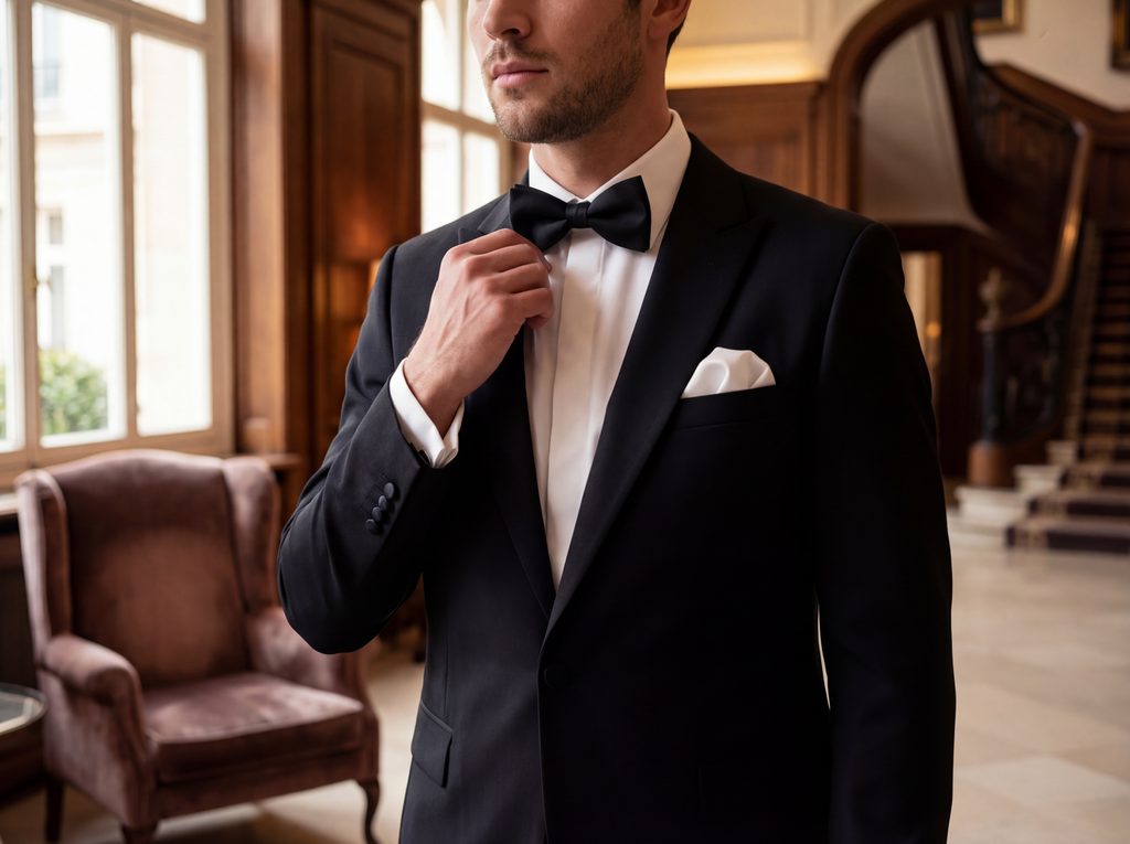 Set dopĺňa biela vreckovka, ktorá vytvára čistý kontrast a zvýrazňuje formálny charakter celku. Motýlik je predviazaný, drží si tvar a pohodlne sedí aj počas dlhších udalostí, takže sa môžete sústrediť na celkový dojem bez potreby úprav.