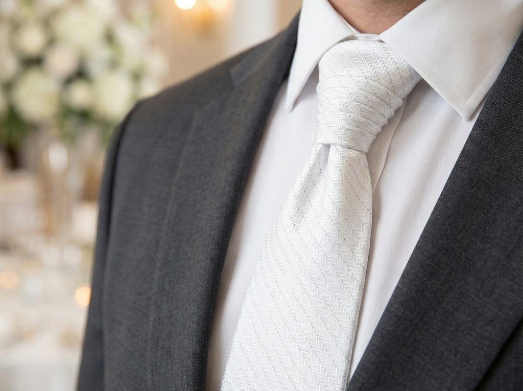 Čierny oblek vytvorí čistý a formálny kontrast. Tmavomodrý pôsobí modernejšie a jemnejšie. Svetlosivý nechá štruktúru regaty prirodzene vyniknúť. Strieborné manžetové gombíky podčiarknu svetlý tón. S bielymi trakmi alebo ladiacou vreckovkou bude výsledok elegantný a dokonale svadobný.