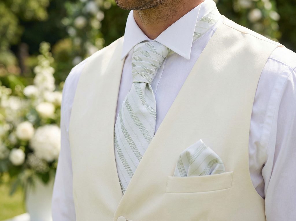 So svetlosivým oblekom pôsobí moderne a sviežo. Pri béžovom obleku vytvorí prirodzenú, jemnú kombináciu. Biela košeľa nechá vyniknúť detail prúžku. Hnedé kožené topánky zachovajú eleganciu. Bezpečná voľba pre ženíchov, ktorí chcú čistý a nadčasový vzhľad.