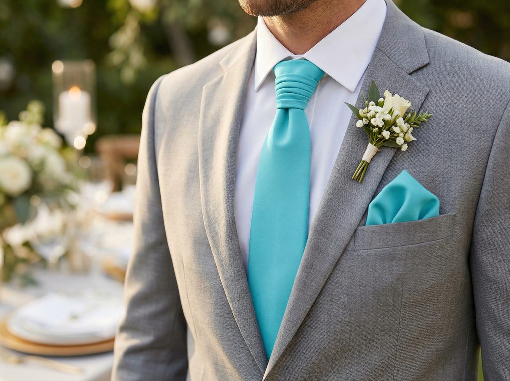 S tmavomodrým oblekom je kontrastná a svieža. So svetlosivým pôsobí ľahšie. Biela košeľa zvýrazní čistotu tónu. Ideálna na letné svadby a oslavy vonku. Vďaka matnému povrchu vyzerá moderne a sebavedomo.