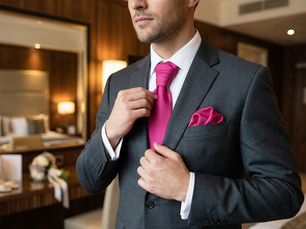 Na modernej svadbe krásne vynikne pri tmavomodrom obleku. S čiernym oblekom vytvorí odvážnejší kontrast. Biela košeľa zvýrazní farbu naplno. Strieborné manžetové gombíky dodajú eleganciu. So svetlými trakmi bude výsledok svieži a štýlový.
