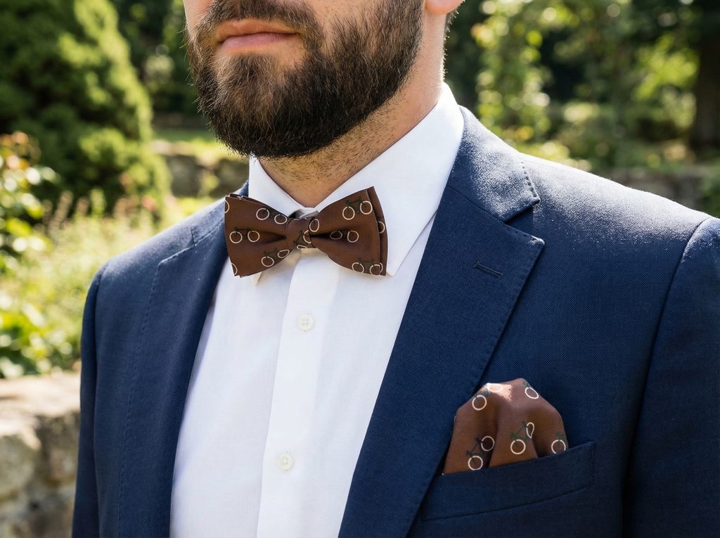 Motív bicykla dodáva doplnku nenápadný, ale zaujímavý charakter. V spojení s hnedým základom pôsobí vyvážene – nie je príliš výrazný, no zároveň nepôsobí obyčajne. Hnedý motýlik so vzorom bicykla a vreckovkou prináša do outfitu jemnú originalitu.