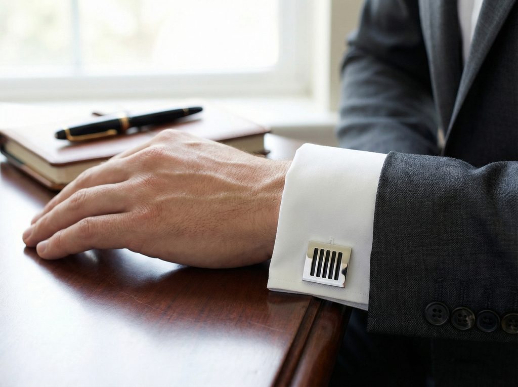 Ako nosiť čierne prúžky Patria ku košeli s dvojitou (francúzskou) manžetou. Manžetu preložte, zarovnajte otvory a gombík zapnite tak, aby prúžky smerovali navonok. Pri podaní ruky kov jemne zableskne a prúžky urobia presne ten detail, ktorý si všimnete až zblízka.