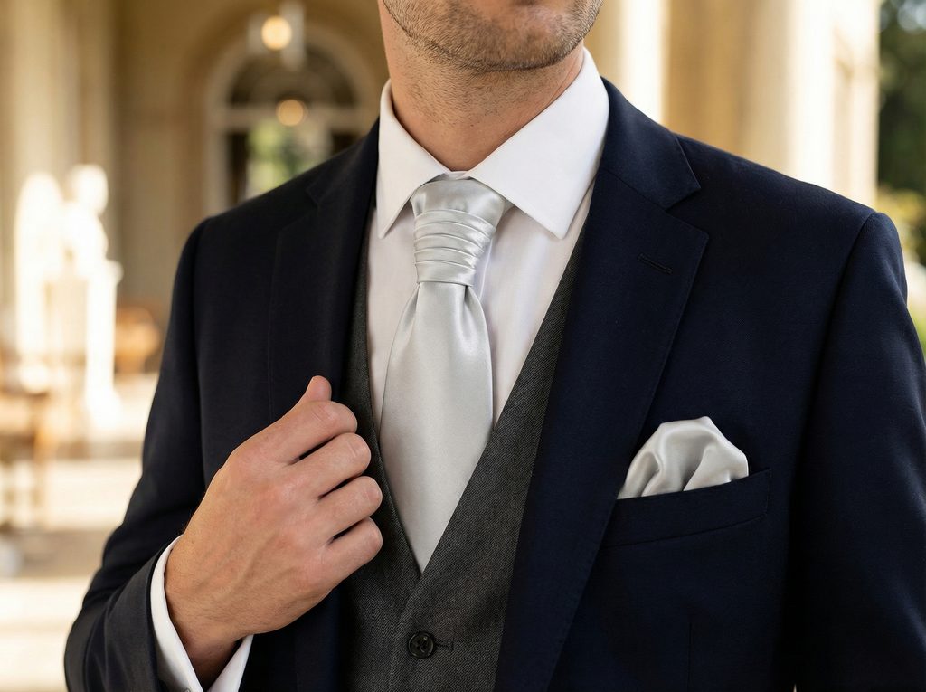 Na večernej svadbe vynikne pri čiernom obleku, kde jej lesk pôsobí mimoriadne slávnostne. Tmavomodrý oblek dodá outfitu modernejší nádych. Čistá biela košeľa zvýrazní jej chladný tón a sviežosť. Strieborné manžetové gombíky podporia farebnú harmóniu. So sivými alebo čiernymi trakmi zostane výsledok elegantný a vyvážený.