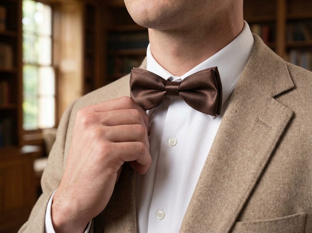 Pracujte s teplými tónmi – béžové alebo svetlohnedé sako vytvorí prirodzený prechod. Ak chcete zvýrazniť farbu, zvoľte bielu pánsku košeľu, ktorá pridá kontrast. Vo formálnejšej kombinácii môžete motýlik nosiť aj s tmavým oblekom, kde jeho odtieň zjemní celkový vzhľad. Vreckovka do saka zo setu potom prepojí celý outfit.