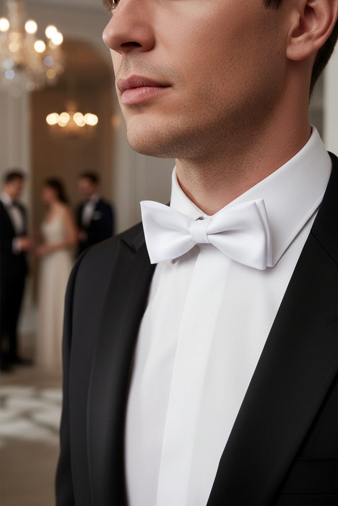 Predviazaný Klasický jednofarebný biely pánsky motýlik o rozmere 12,5 cm dokonale padne k akejkoľvek frakovej či smokingovej košeli. Na zadnej strane motýliku je pripevnený háčik s očkom, vďaka tomu je možné ľahko regulovať dĺžku podľa obvodu Vášho krku.