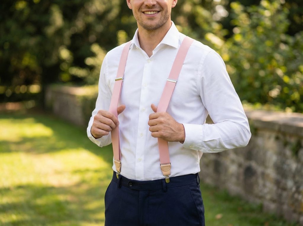 Pudrový odtieň sa dobre kombinuje napríklad s bielou, svetlosivou alebo svetlomodrou košeľou. Zaujímavo pôsobí aj v spojení s béžovým sakom alebo tmavšími nohavicami. Traky tak vytvárajú jemný, ale výrazný detail, ktorý dokáže oživiť celý outfit.