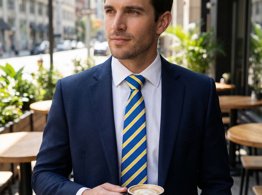 Farebný detail na kravate dokáže oživiť aj jednoduchú kombináciu košele a saka. Modrá kravata so žltými pruhmi zaujme kontrastným vzorom, ktorý dodá outfitu energickejší vzhľad a pritom zostáva vhodný aj pre formálnejšie príležitosti.
