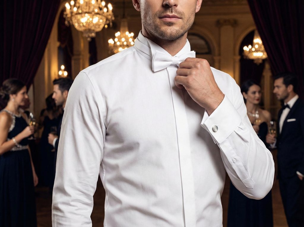 Kombinujte s čiernym frakom alebo smokingom a klasickým čiernym motýlikom. Vhodné sú strieborné, perleťové alebo minimalistické čierne manžetové gombíky. Pre tradičný formálny vzhľad môžete doplniť bielu piké vestu podľa typu udalosti.
