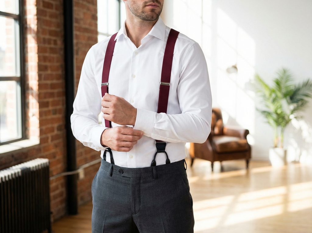 Bordová farba dodáva outfitu hĺbku, čierna koža mu dáva pevný rám. Bordové traky s čiernym koženým stredom a pútkami z pravej kože pôsobia výrazne, no stále uhladene.