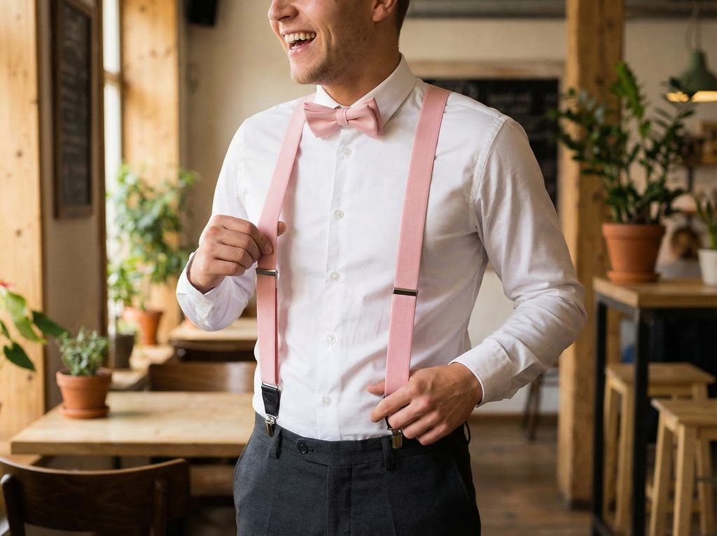 Svetlé doplnky dokážu outfit príjemne odľahčiť a dodať mu svieži charakter. Pudrové pánske traky s čiernymi koženými detailmi prinášajú zaujímavý farebný kontrast, ktorý pôsobí moderne a elegantne zároveň. Jemný pudrový odtieň látky sa pekne dopĺňa s čiernou pravou kožou, čím vzniká doplnok vhodný pre formálne aj štýlovo ladené kombinácie.