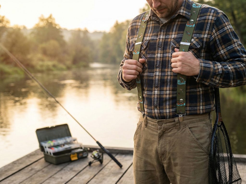 Navrhnuté pre mužov, ktorí si vedia užiť pokoj pri vode aj aktívny deň v prírode. Khaki traky s rybárskym motívom, koženým stredom a kovovými klipmi spájajú tematický vzhľad s praktickou funkciou.