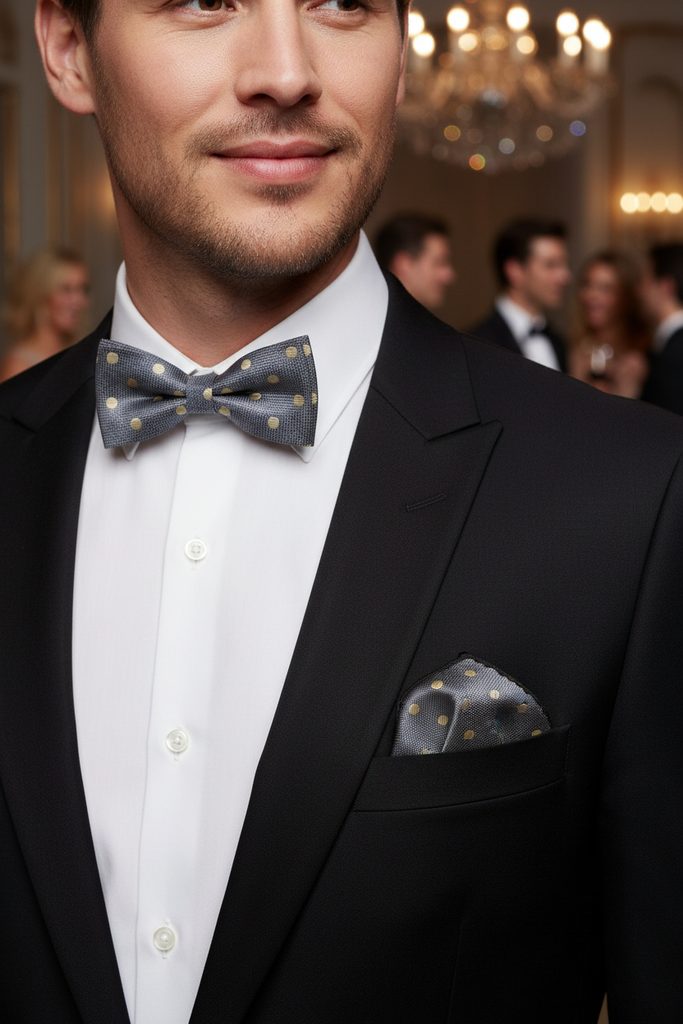Predviazaný Šedý motýlik s béžovou bodkou a vreckovkou o rozmere 12,5 cm dokonale padne k akejkoľvek frakovej či smokingovej košeli. Na zadnej strane motýliku je pripevnený háčik s očkom, vďaka tomu je možné ľahko regulovať dĺžku podľa obvodu Vášho krku.