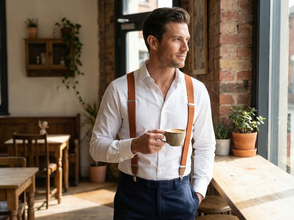 Teplé prírodné odtiene patria medzi doplnky, ktoré pôsobia elegantne a zároveň veľmi prirodzene. Škoricovo hnedé pánske traky s hnedými koženými detailmi prinášajú do outfitu jemný, sofistikovaný akcent. Harmonická kombinácia látky v škoricovom odtieni a pravej hnedej kože vytvára doplnok, ktorý sa hodí k formálnym aj moderným kombináciám.