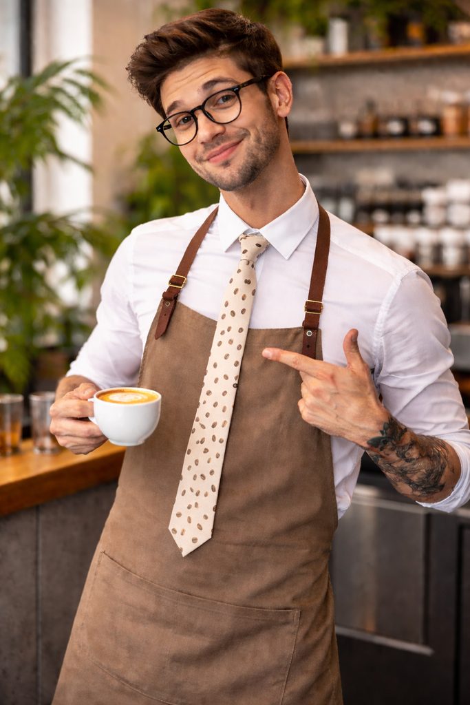 Táto krémová kravata zaujme na prvý pohľad svojím netradičným vzorom. Malé motívy kávových zŕn dodávajú doplnku hravý detail, ktorý dokáže oživiť aj klasický elegantný outfit.