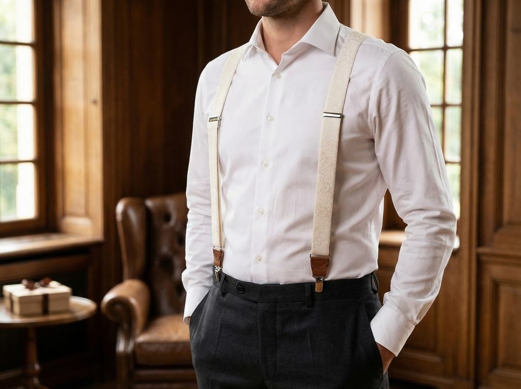 Svetlé doplnky dokážu outfitu dodať ľahkosť a noblesu. Smetanové pánske traky s jemným lesklým vzorom pôsobia elegantne a veľmi vkusne, preto sú ideálnou voľbou najmä k spoločenskému oblečeniu. Svetlý odtieň v kombinácii s hnedými detailmi z pravej kože vytvára harmonický doplnok, ktorý zaujme svojou decentnou eleganciou.