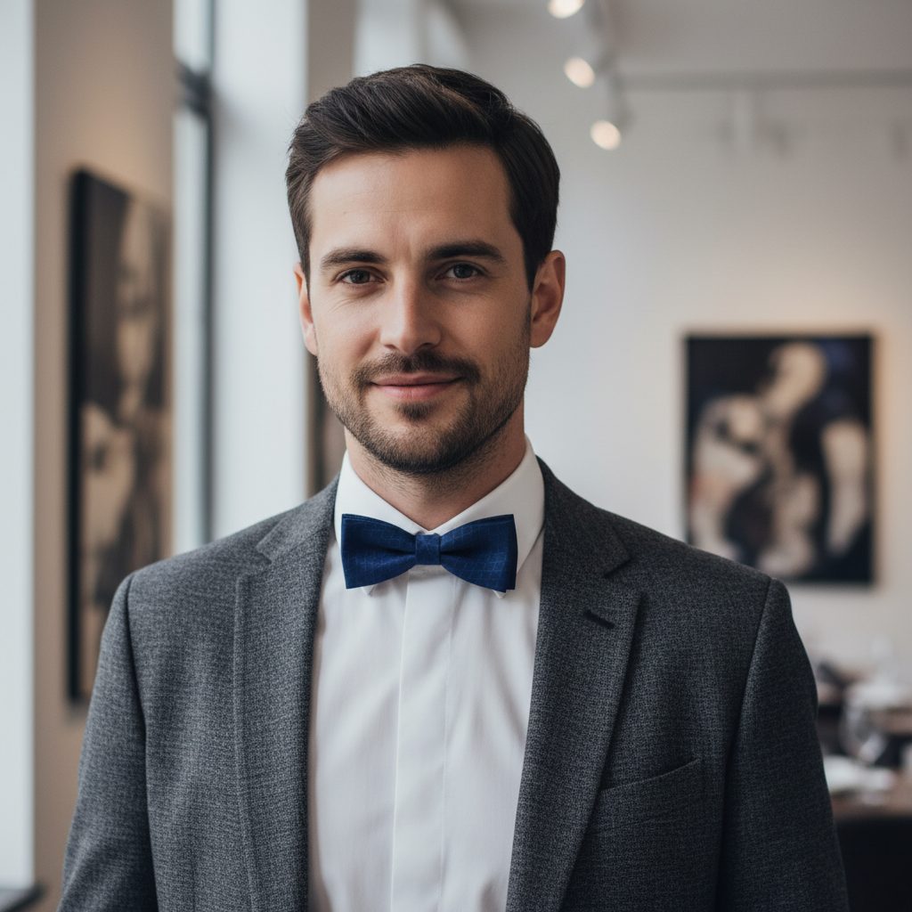Predviazaný Tmavo modrý bavlnený pánsky motýlik s modrým vzorom o rozmere 10 cm dokonale padne k akejkoľvek frakovej či smokingovej košeli. Na zadnej strane motýliku je pripevnený háčik s očkom, vďaka tomu je možné ľahko regulovať dĺžku podľa obvodu Vášho krku.