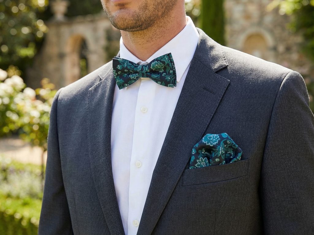 Tyrkysový vzor najlepšie vynikne v kombinácii s tmavšími alebo neutrálnymi tónmi – tmavomodré či sivé sako vytvorí pevný základ. S béžovým alebo svetlejším sakom pôsobí outfit uvoľnenejšie a sviežejšie. Jednofarebná košeľa pomôže udržať čistý styling a nechá vzor vyniknúť. Motýlik sa hodí najmä na svadby, spoločenské udalosti, letné oslavy aj menej formálne večerné príležitosti.