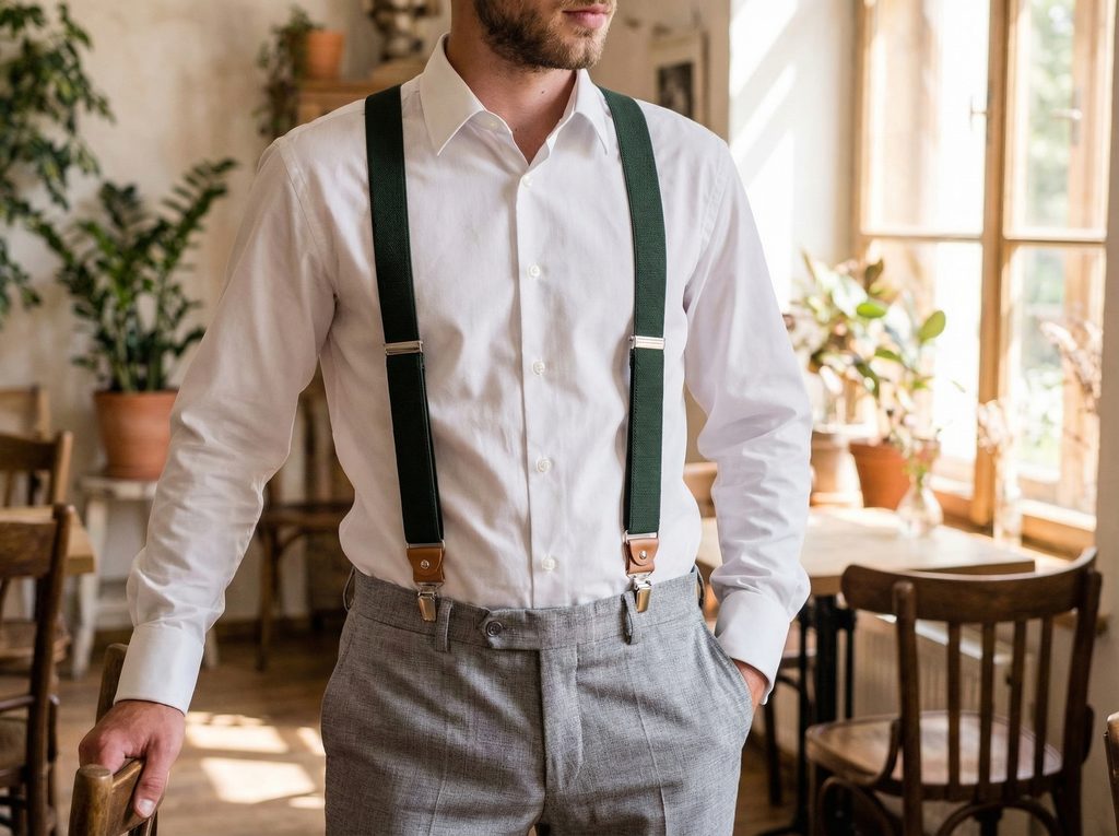 Doplnok, ktorý dokáže udržať nohavice pohodlne na mieste a zároveň doplniť celý outfit. Zelené elastické traky s koňakovo hnedými koženými detailmi kombinujú praktickú funkciu s elegantným vzhľadom.