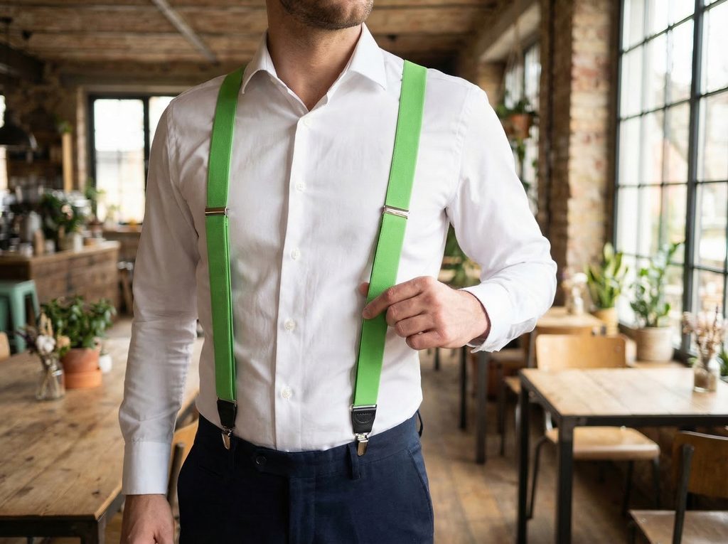 Zelená farba dokáže príjemne doplniť napríklad bielu, krémovú alebo svetlomodrú košeľu. Pekne sa kombinuje aj s béžovým sakom alebo tmavými nohavicami. Traky tak vytvárajú výrazný, ale stále elegantný detail outfitu.