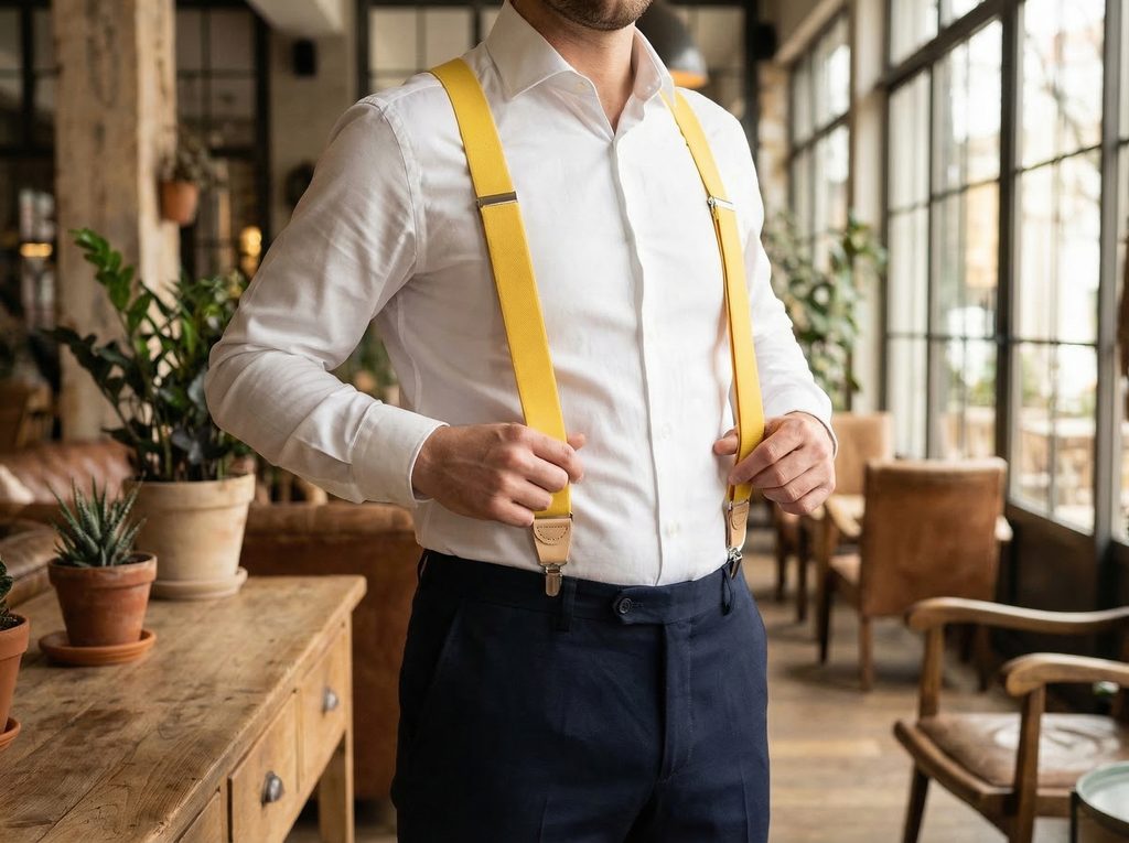 Niektoré doplnky dokážu outfit rozžiariť na prvý pohľad. Žlté pánske traky s béžovými koženými detailmi prinášajú do oblečenia svieži a energický akcent. Výrazný odtieň látky v kombinácii so svetlou pravou kožou vytvára zaujímavý kontrast, ktorý pôsobí moderne a zároveň elegantne.